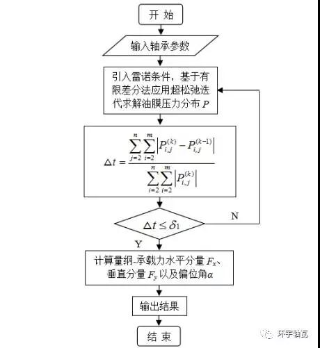 根據(jù)此組壓力值,再用相應(yīng)的數(shù)值積分,便可進(jìn)一步求得穩(wěn)態(tài)條件下軸承油膜承載力,其計(jì)算流程如圖2。