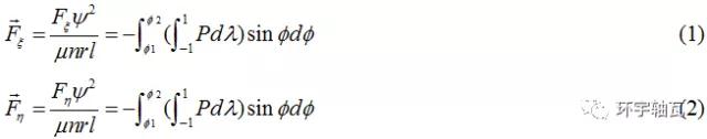 對(duì)于有限寬軸承,水平、垂直方向油膜合力如圖3所示,其無(wú)量綱值為: