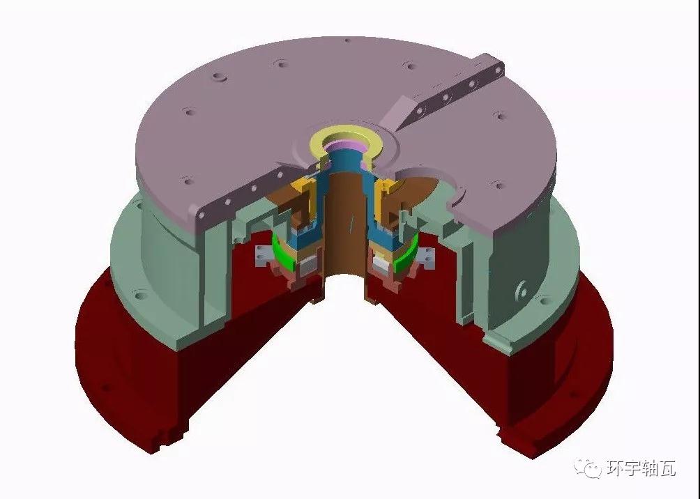 根據(jù)不同工況載荷,可采用不同的潤滑方式:自潤滑或壓力油循環(huán)潤滑。對自潤滑型軸承,其冷卻通常有自然冷卻或通過安裝在殼體內(nèi)的冷卻器或冷卻水道通水進(jìn)行冷卻。潤滑油在推力環(huán)旋轉(zhuǎn)的作用下,通過導(dǎo)瓦上油槽動壓效應(yīng)分布于導(dǎo)瓦與推力環(huán)之間進(jìn)行油膜潤滑,同時進(jìn)入推力環(huán)與上下推力瓦的工作面進(jìn)行潤滑,依靠油-水冷卻系統(tǒng)冷卻后循環(huán)潤滑。