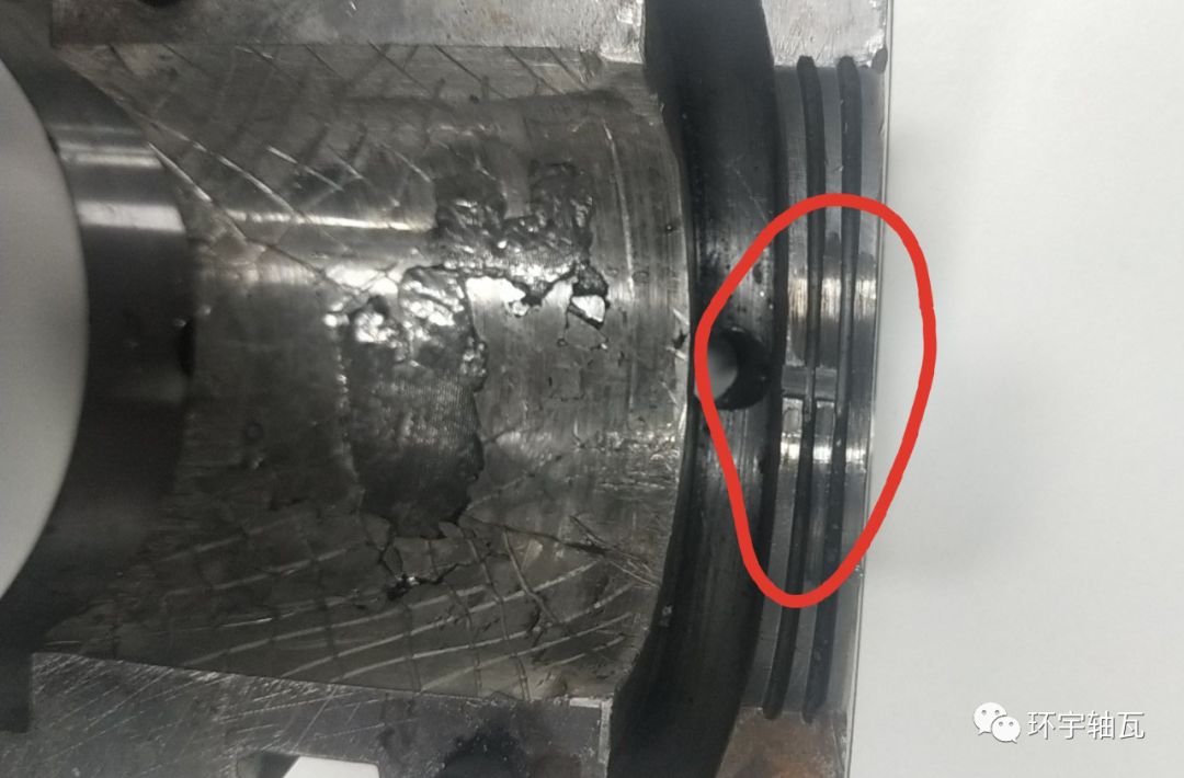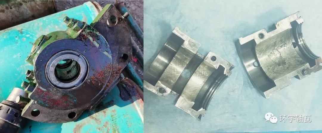 2. 下瓦合金大面積剝落和裂紋,且剝落表象不規(guī)則,此為疲勞剝落的典型形態(tài);(在交變載荷的作用下,軸承合金表面出現(xiàn)與滑動方向垂直的疲勞裂紋,當裂紋向軸承合金襯與襯背結合面擴展后,造成軸承合金的剝落。)